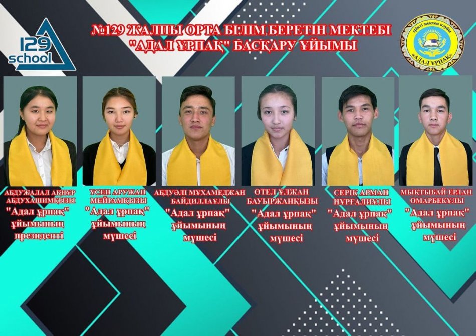 14 ақпан 2023 0 1 2 3 4 5 «АДАЛ ҰРПАҚ» БАСҚАРУ ҰЙЫМЫ №129 жалпы орта білім беретін мектебінің «Адал ұрпақ» басқару ұйымының мүшелері
