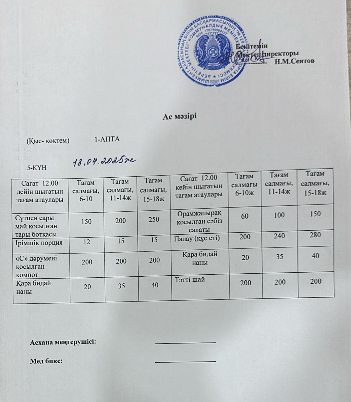 18.04.2025ж Бір күндік асхана мәзірі » №129 жалпы орта білім беретін мектеп