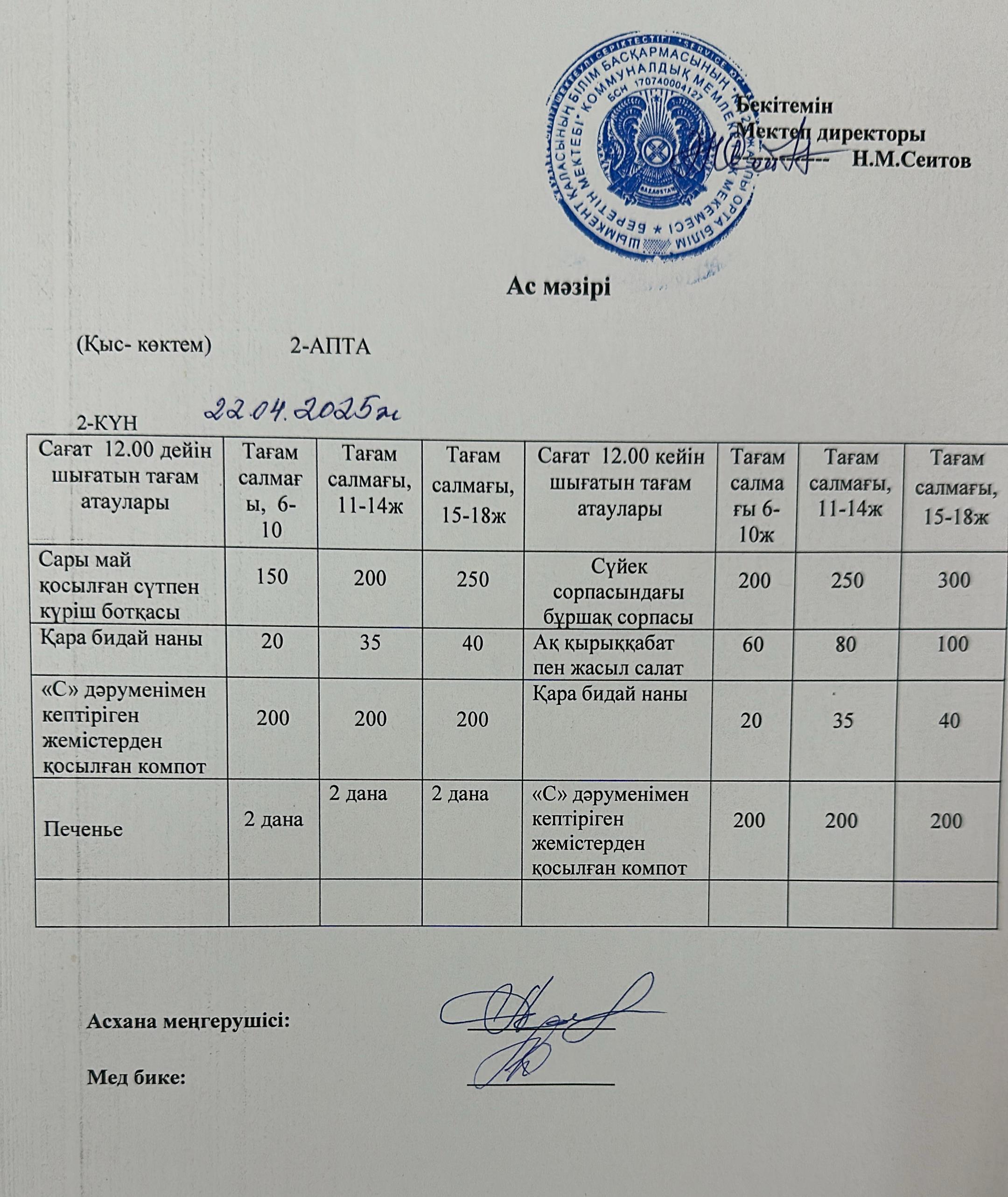 22.04.2025ж Бір күндік асхана мәзірі » №129 жалпы орта білім беретін мектеп