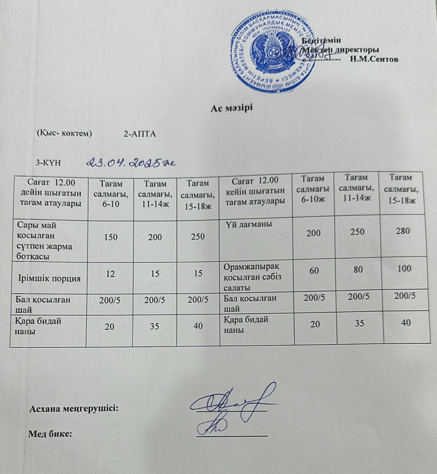 23.04.2025ж Бір күндік асхана мәзірі