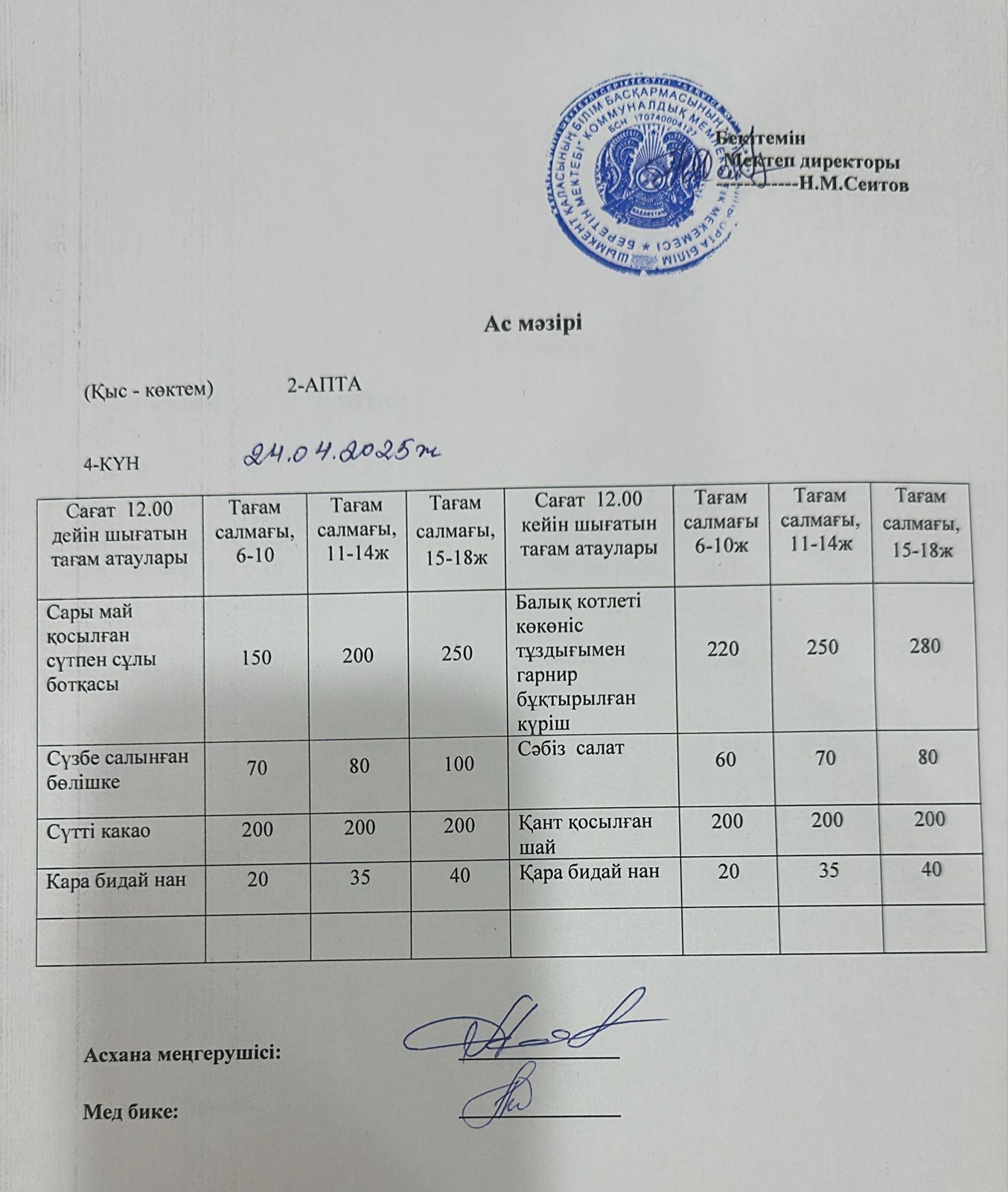 24.04.2025ж Бір күндік асхана мәзірі » №129 жалпы орта білім беретін мектеп