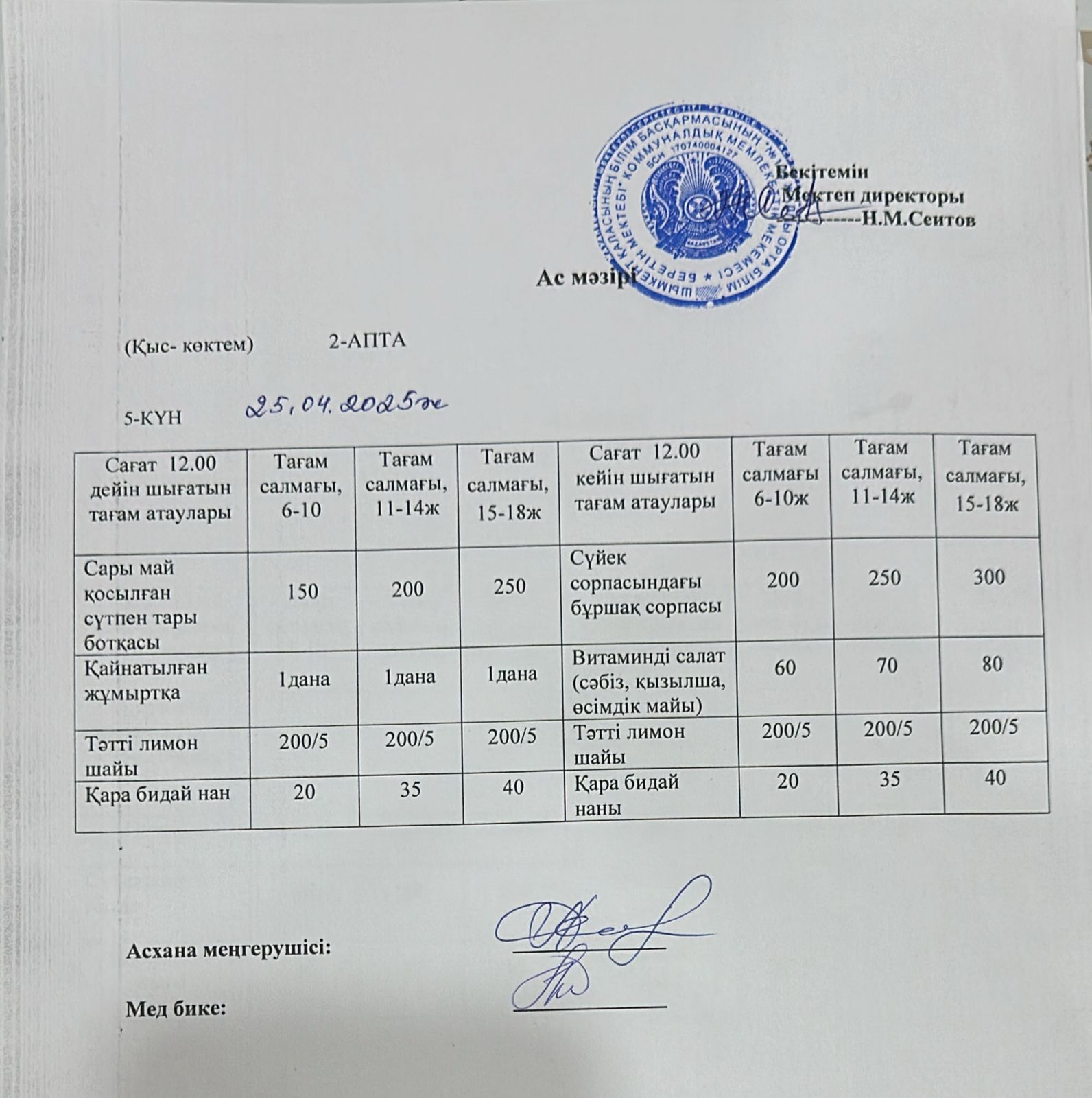 25.04.2025ж Бір күндік асхана мәзірі » №129 жалпы орта білім беретін мектеп
