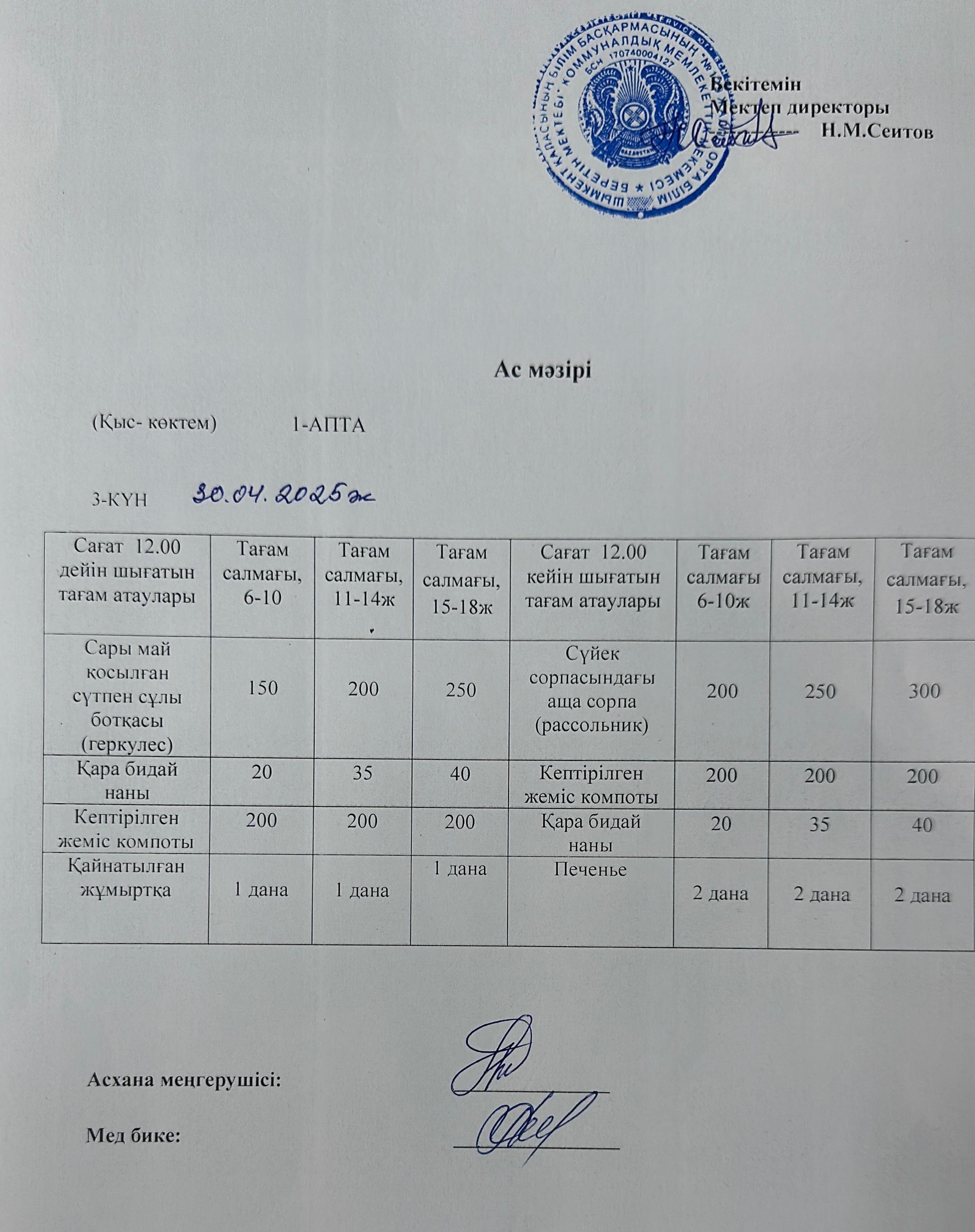 30.04.2025ж Бір күндік асхана мәзірі » №129 жалпы орта білім беретін мектеп