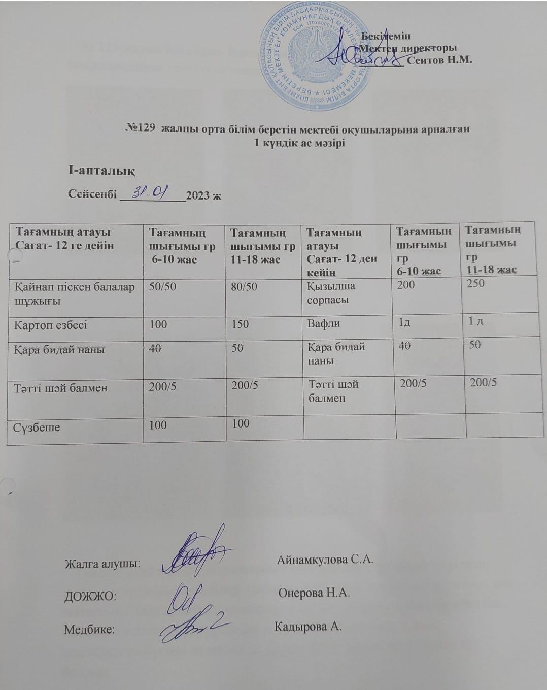 Бір күндік Ас мәзірі » №129 жалпы орта білім беретін мектеп