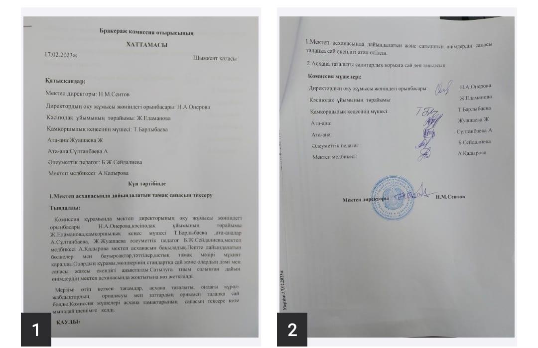 » » » Тамақтандырудың сапасына мониторинг жүргізу жөніндегі комиссия актісі