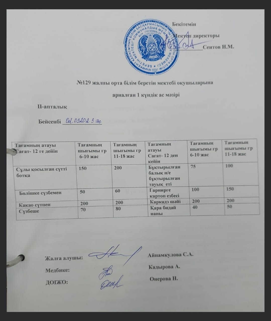 03 наурыз 2023 0 1 2 3 4 5 "Мектептік тамақтандыру" мектеп асханасының бір күндік ыстық тамақпен қамтылу ас мәзірі