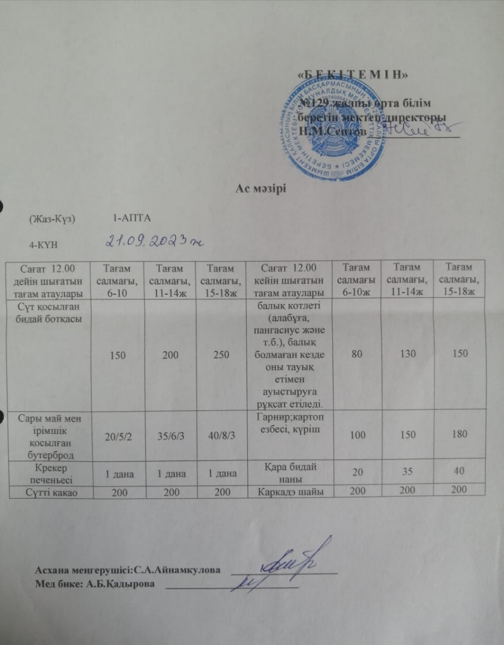 Ас мәзірі 21.09.2023ж » №129 жалпы орта білім беретін мектеп