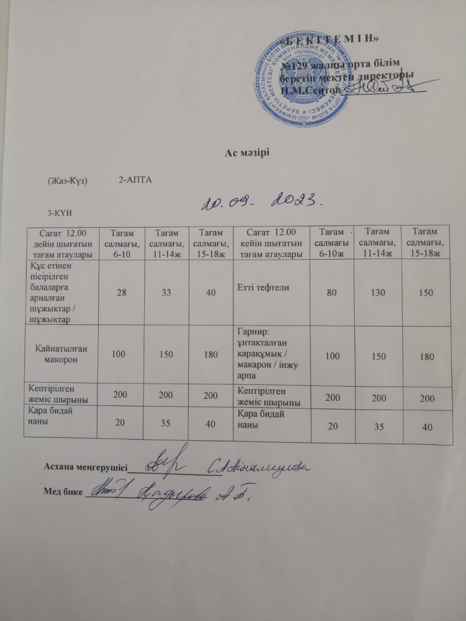 Ас мәзірі 20.09.2023ж » №129 жалпы орта білім беретін мектеп