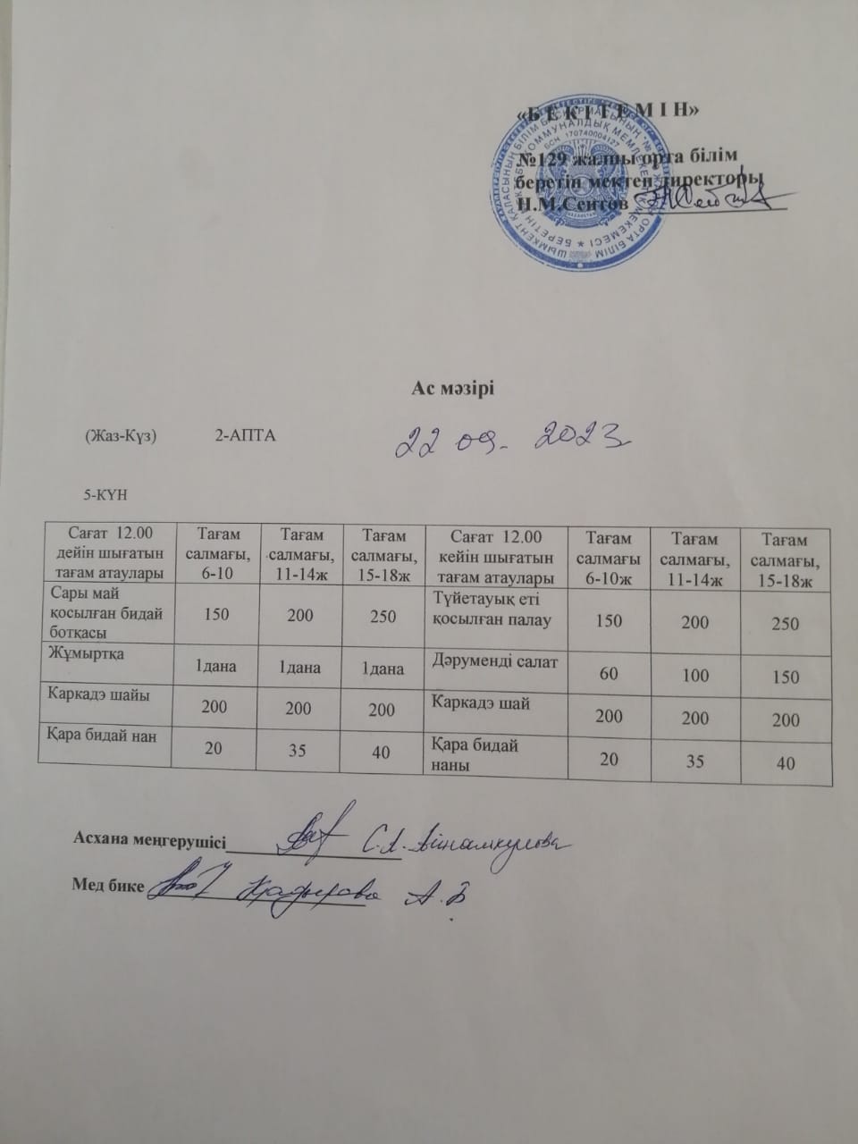 Ас мәзірі 22.09.2023ж » №129 жалпы орта білім беретін мектеп