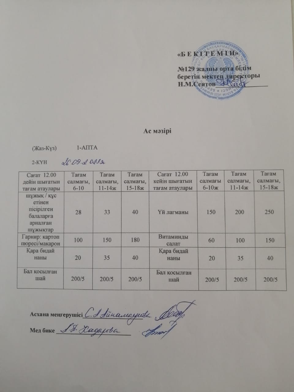 Ас мәзірі 26.09.2023ж » №129 жалпы орта білім беретін мектеп
