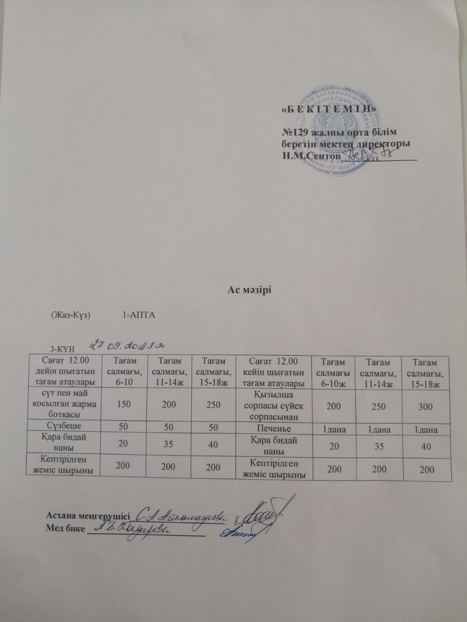 Ас мәзірі 27.09.2023ж » №129 жалпы орта білім беретін мектеп