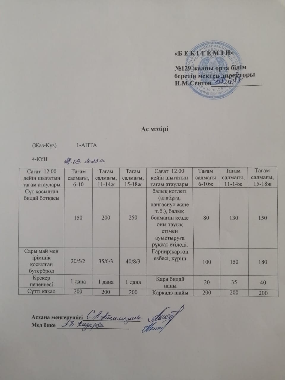 Ас мәзірі 28.09.2023ж » №129 жалпы орта білім беретін мектеп