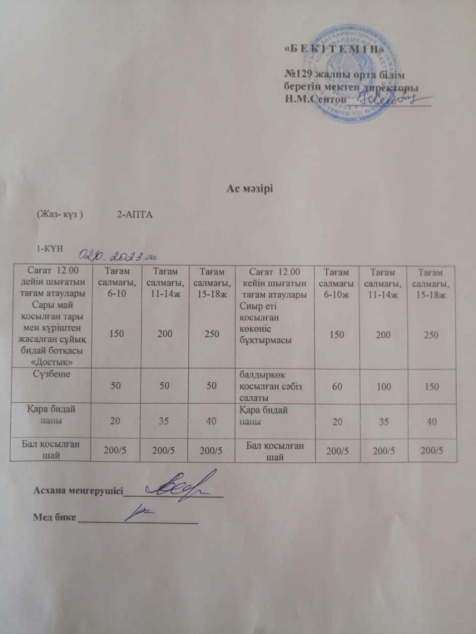 Ас мәзірі 02.10.2023ж » №129 жалпы орта білім беретін мектеп