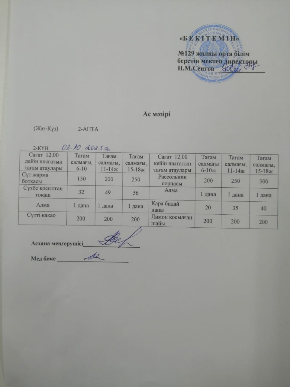 Асхана мәзірі 03.10.2023ж » №129 жалпы орта білім беретін мектеп