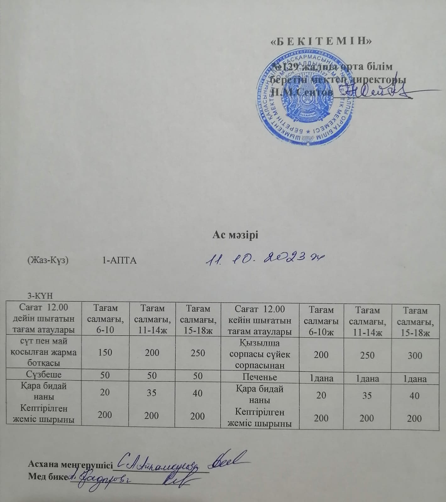 Ас мәзірі 11.10.2023ж » №129 жалпы орта білім беретін мектеп