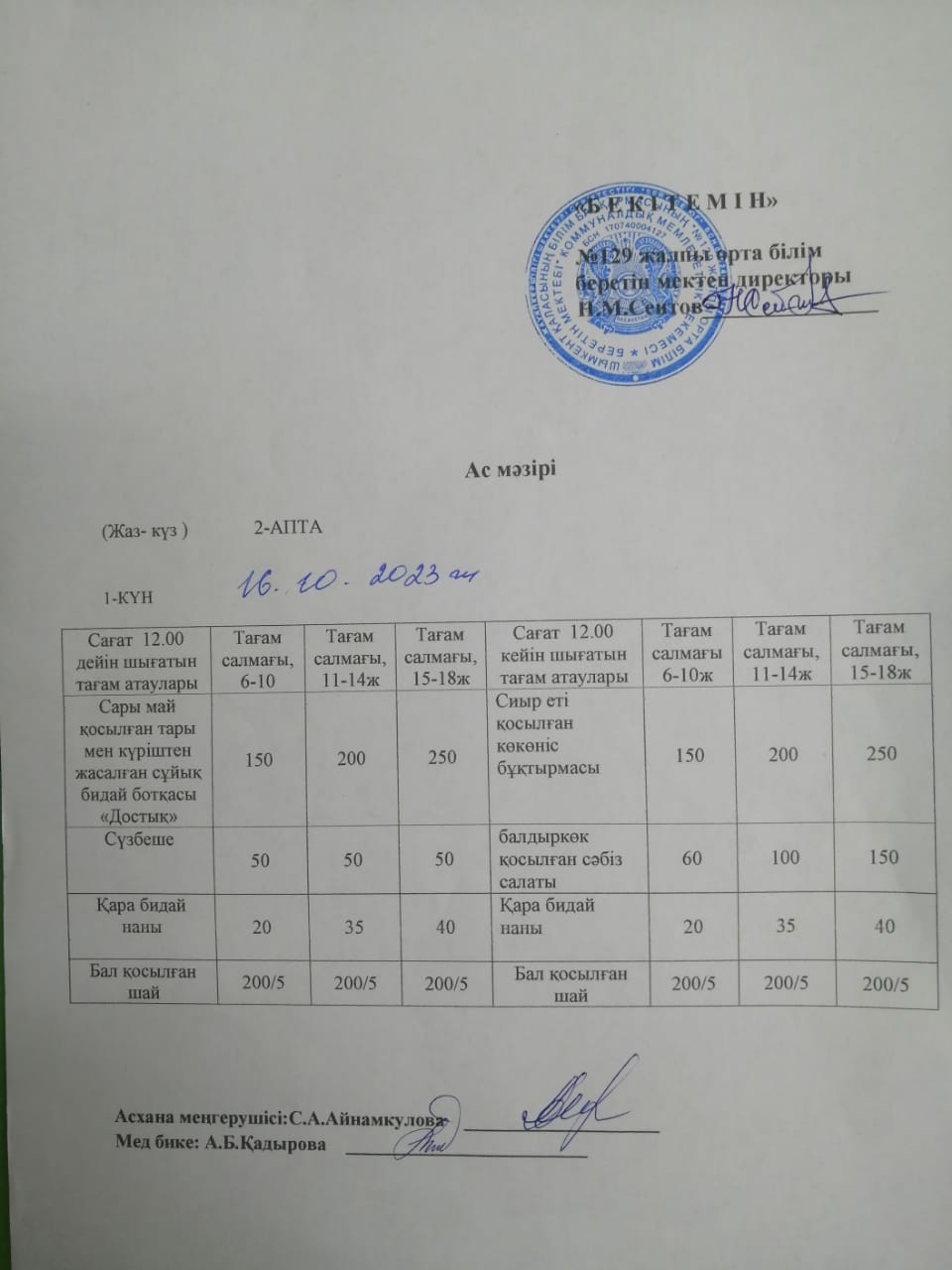 Ас мәзірі 16.10.2023ж » №129 жалпы орта білім беретін мектеп