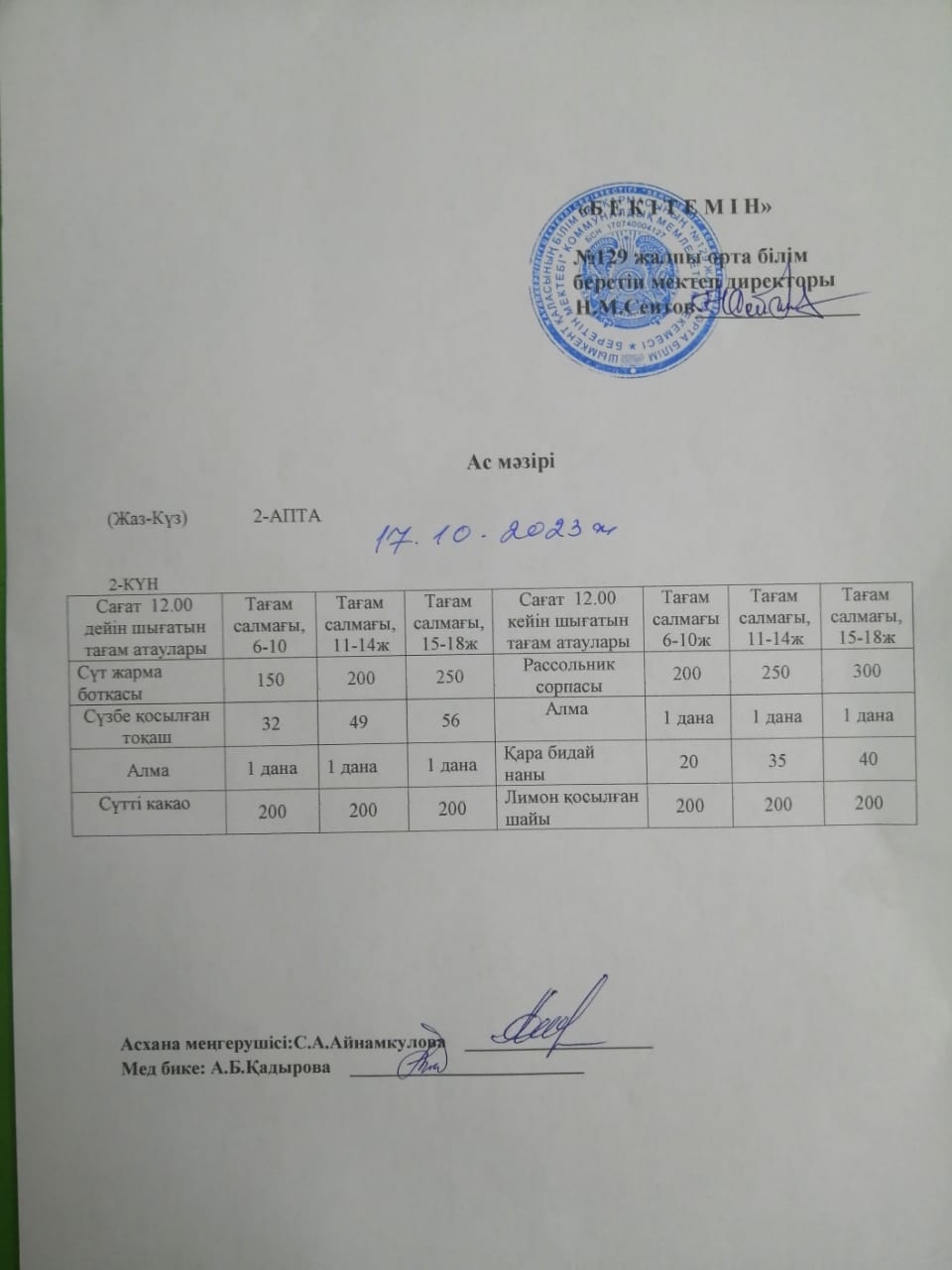 Ас мәзірі 17.10.2023ж » №129 жалпы орта білім беретін мектеп