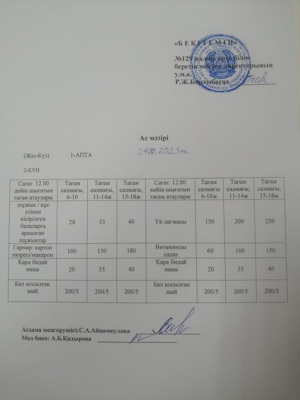 Ас мәзірі 24.10.2023ж » №129 жалпы орта білім беретін мектеп