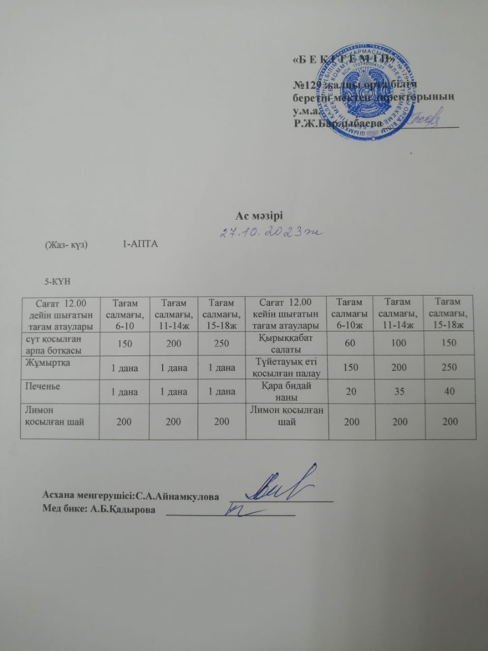 Ас мәзірі 27.10.2023ж » №129 жалпы орта білім беретін мектеп