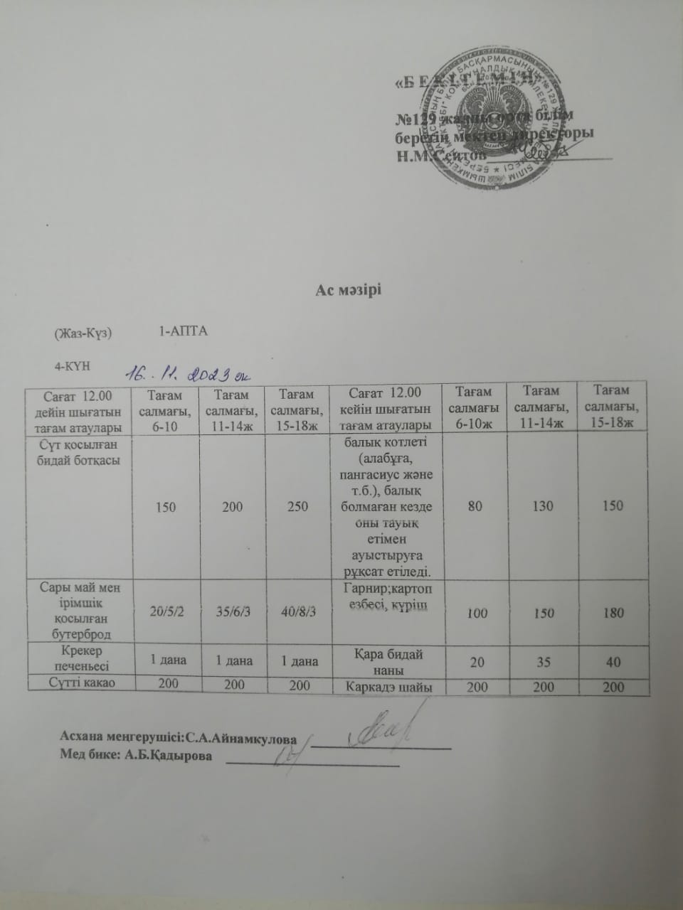 Ас мәзірі 16.11.2023ж » №129 жалпы орта білім беретін мектеп