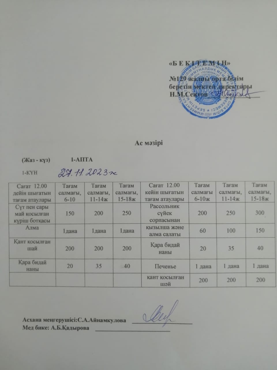 27.11.2023ж. Бір күндік асхана мәзірі » №129 жалпы орта білім беретін мектеп