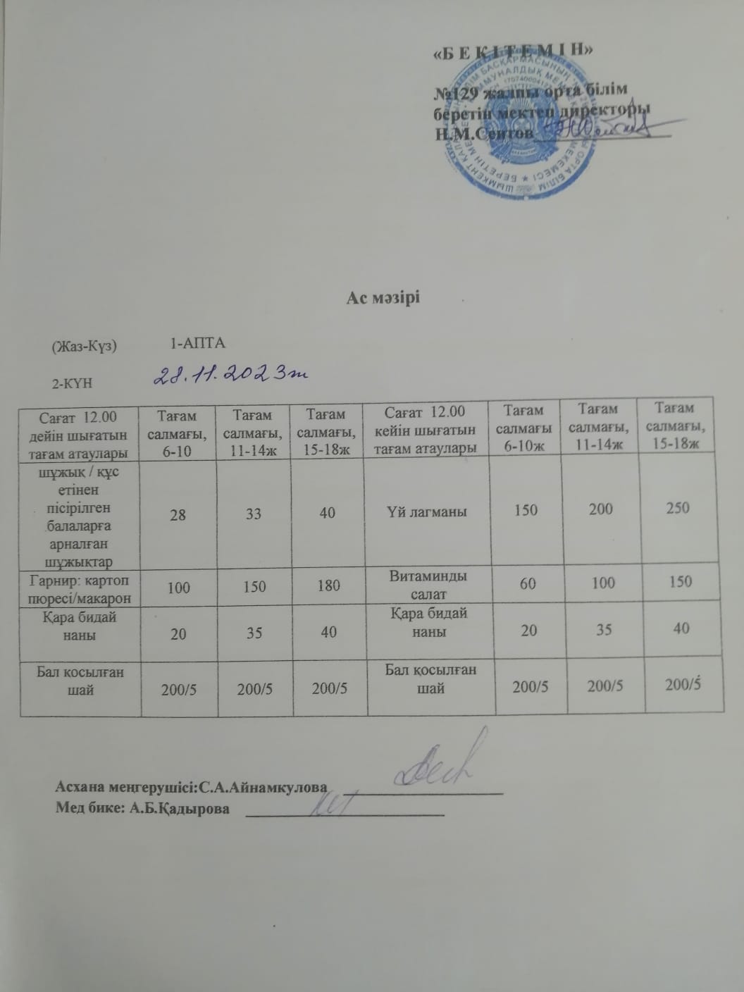 28.11.2023ж. Бір күндік асхана мәзірі » №129 жалпы орта білім беретін мектеп