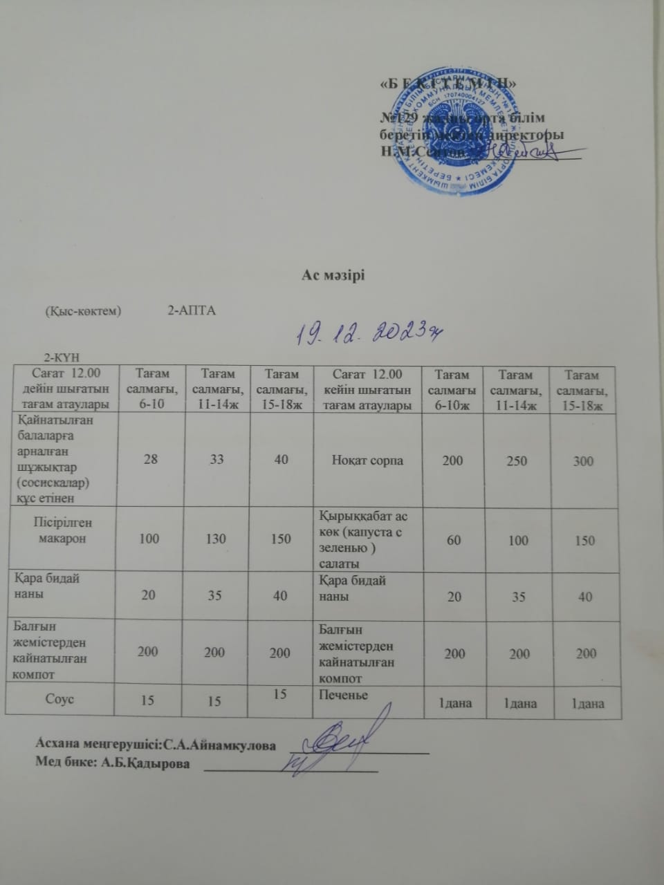 19.12.2023ж Бір күндік асхана мәзірі » №129 жалпы орта білім беретін мектеп