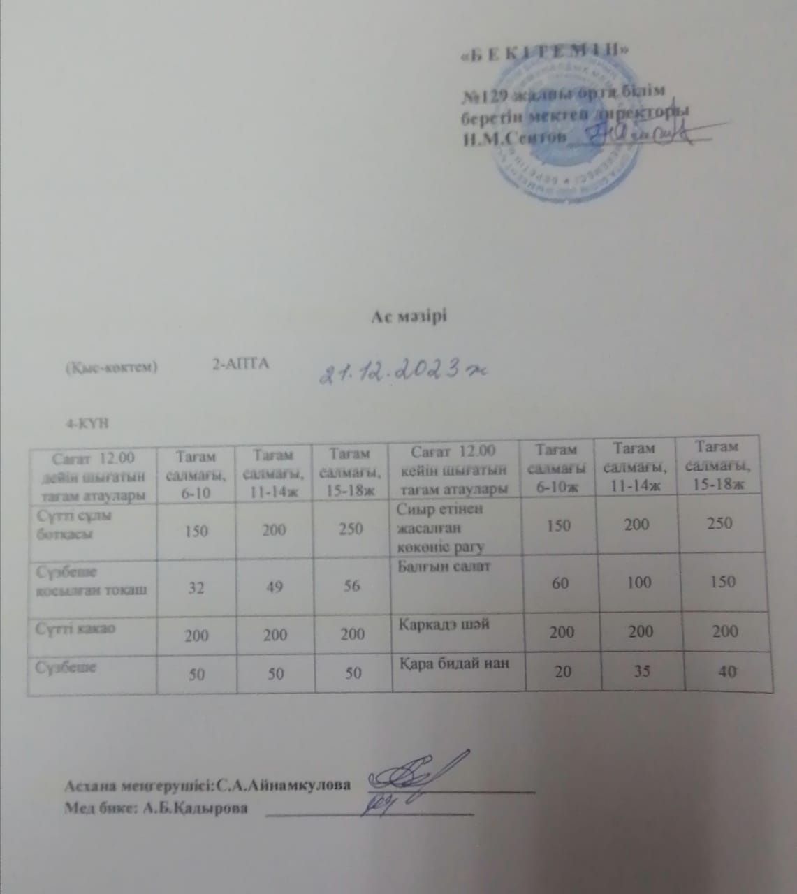 21.12.2023ж Бір күндік асхана мәзірі » №129 жалпы орта білім беретін мектеп