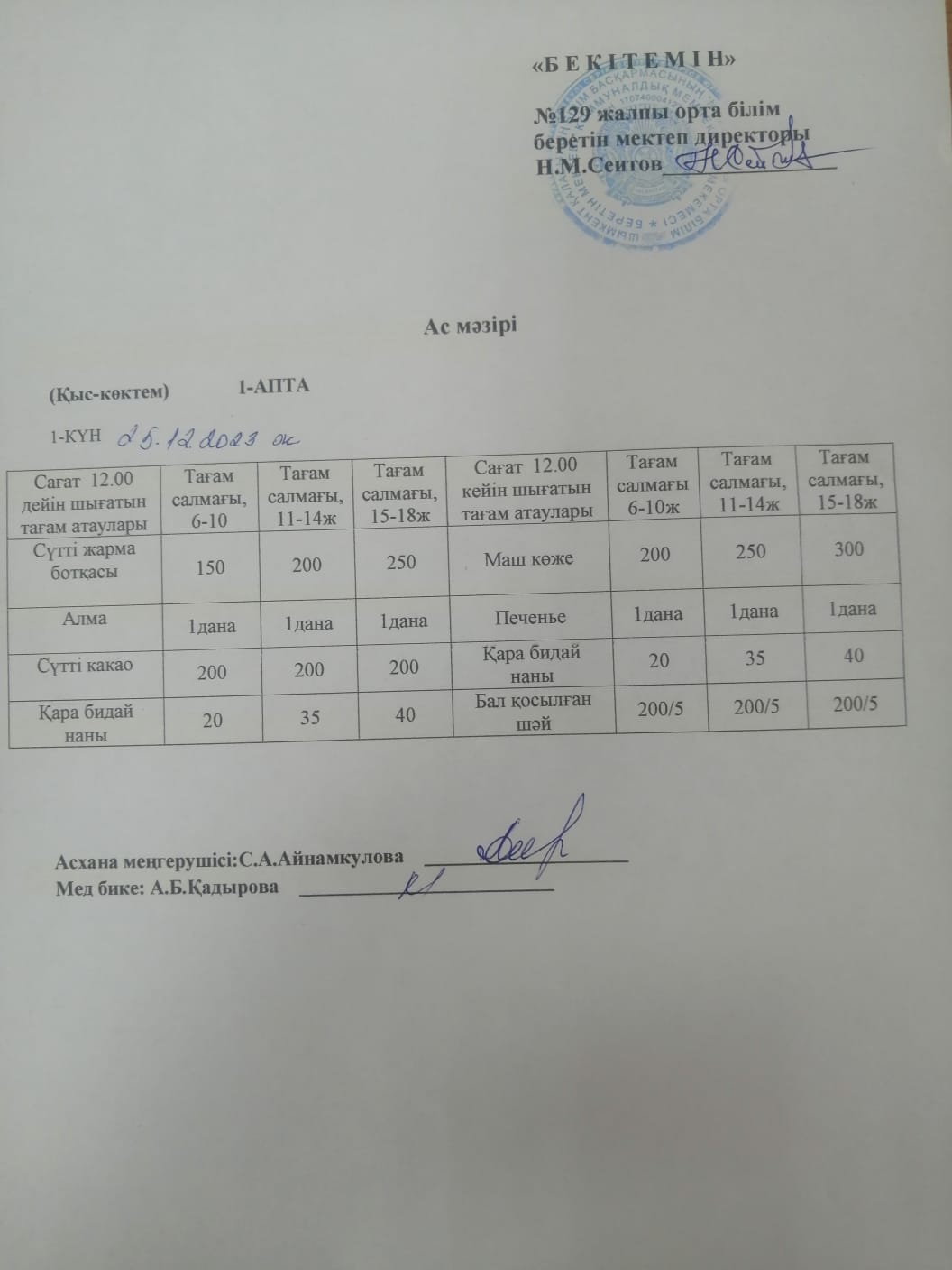 25.12.2023ж. Бір күндік асхана мәзірі » №129 жалпы орта білім беретін мектеп