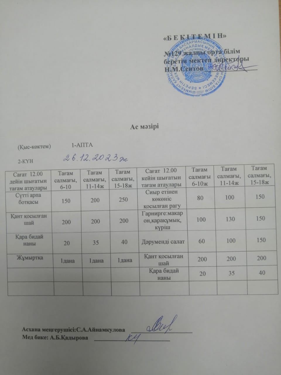 26.12.2023ж Бір күндік асхана мәзірі » №129 жалпы орта білім беретін мектеп