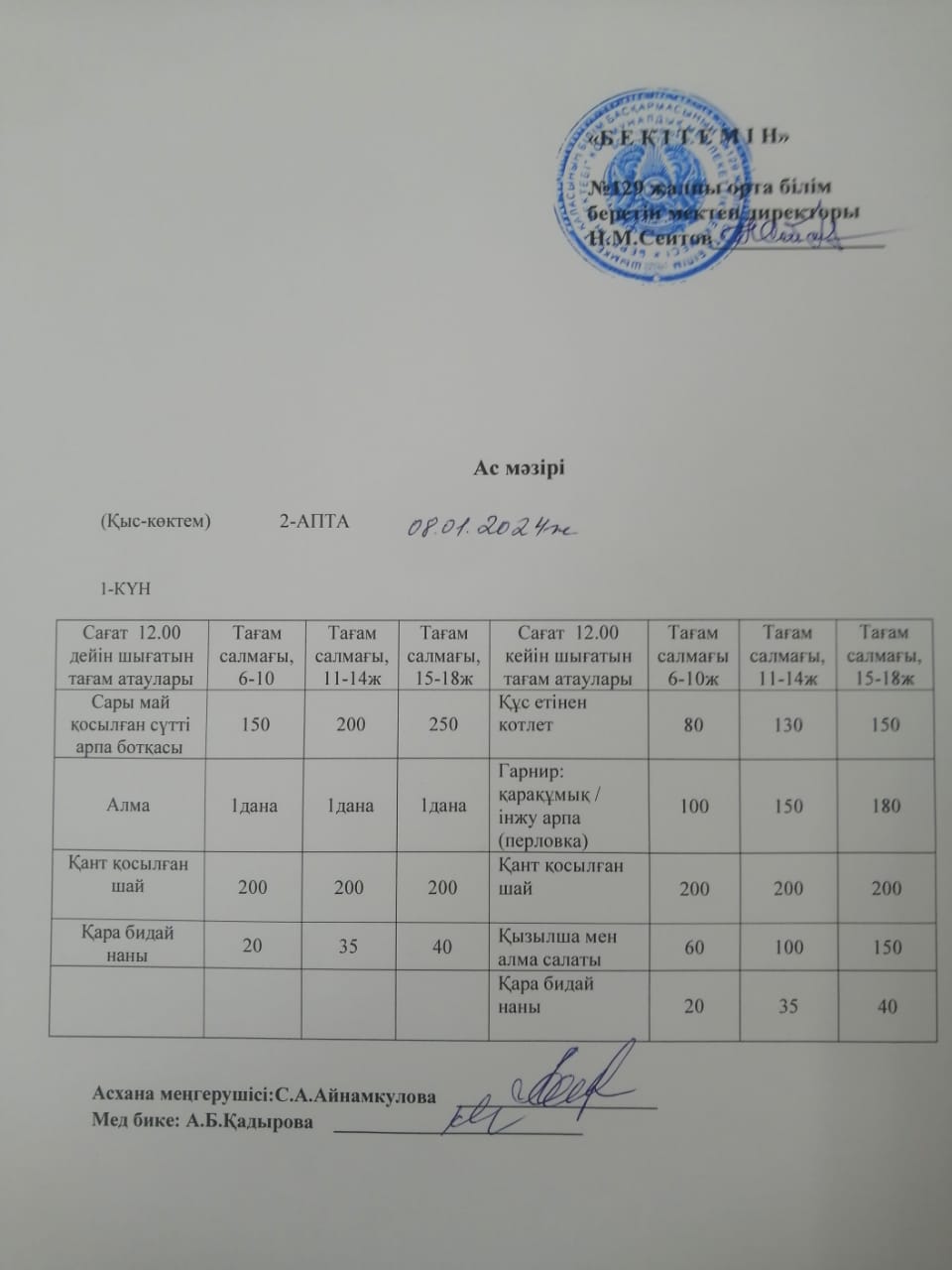 08.01.2024ж Бір күндік асхана мәзірі » №129 жалпы орта білім беретін мектеп