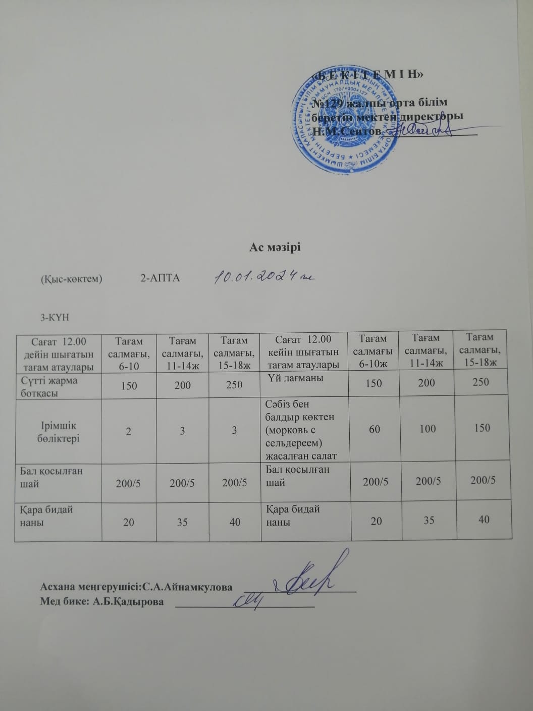 10.01.2024ж. Бір күндік асхана мәзірі » №129 жалпы орта білім беретін мектеп