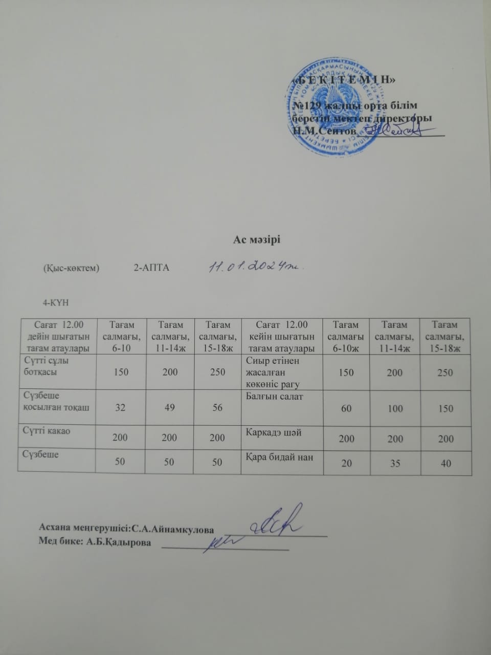 11.01.2024ж. Бір күндік асхана мәзірі » №129 жалпы орта білім беретін мектеп