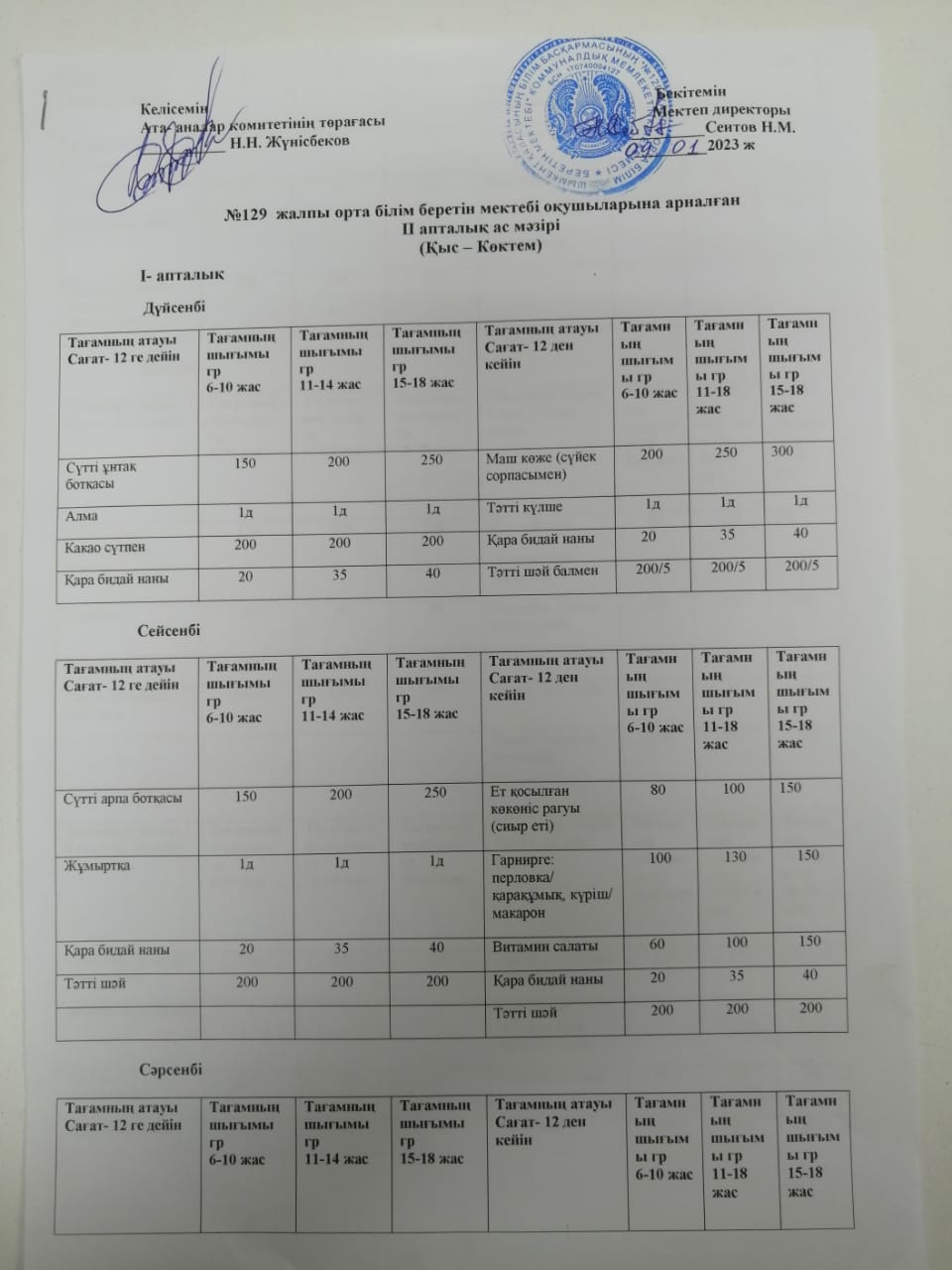 Қыс-Көктем апталық ас мәзірі 2023ж » №129 жалпы орта білім беретін мектеп