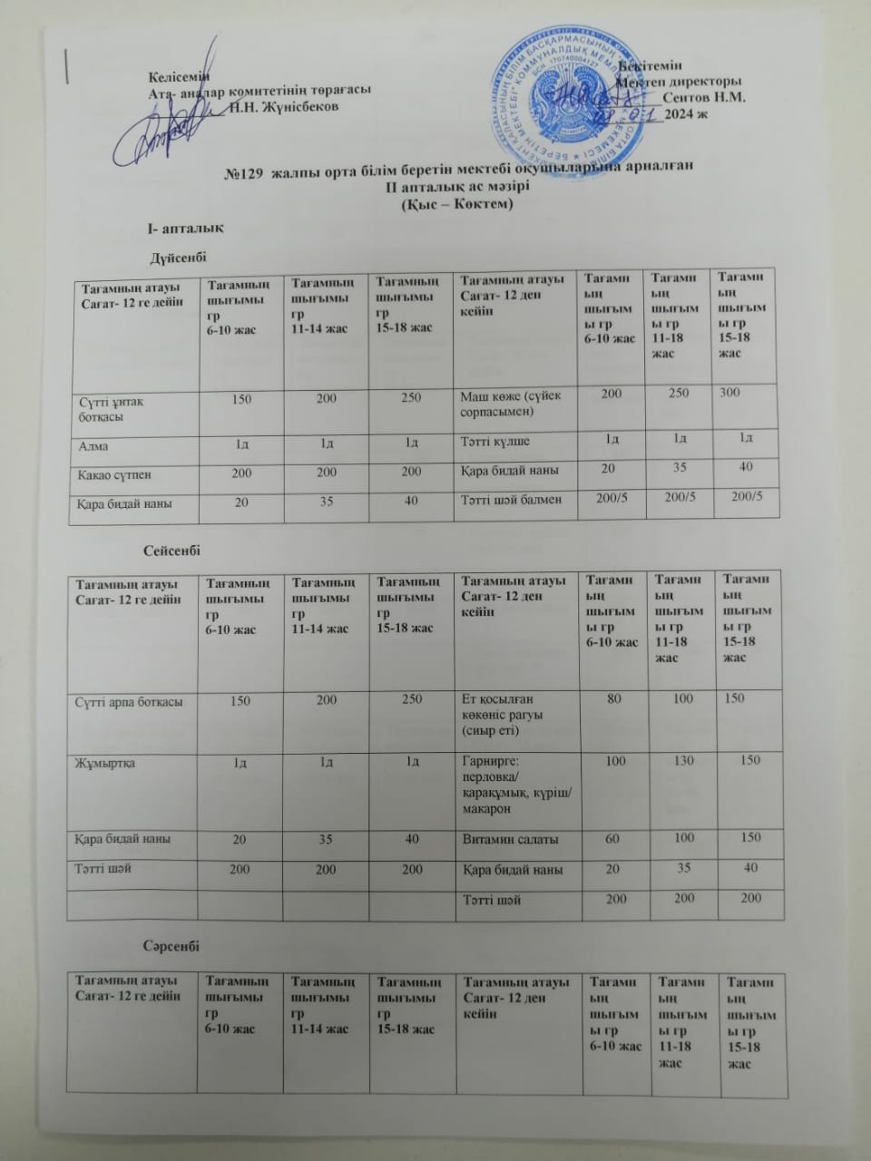 Қыс-Көктем апталық ас мәзірі 2024ж » №129 жалпы орта білім беретін мектеп