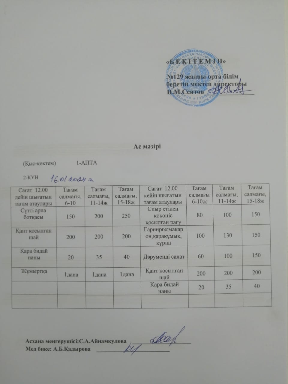 16.01.2024ж. Бір күндік асхана мәзірі » №129 жалпы орта білім беретін мектеп