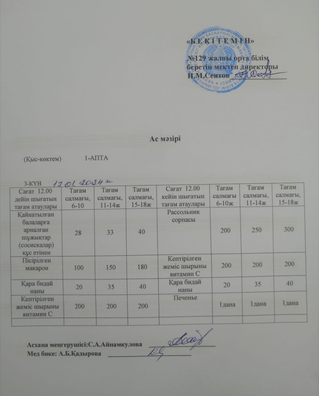 17.01.2024ж. Бір күндік асхана мәзірі » №129 жалпы орта білім беретін мектеп