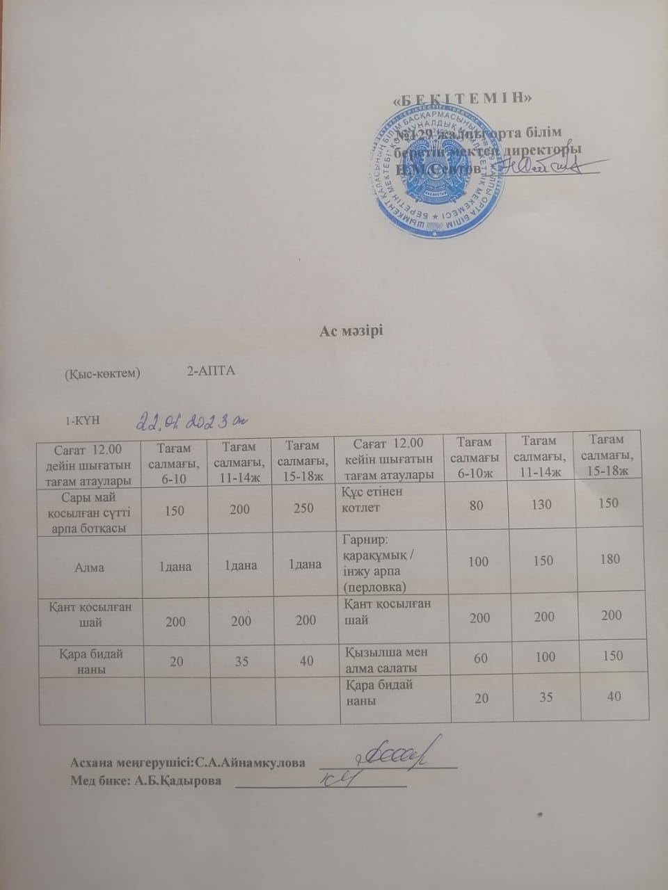 22.01.2024ж Бір күндік асхана мәзірі » №129 жалпы орта білім беретін мектеп