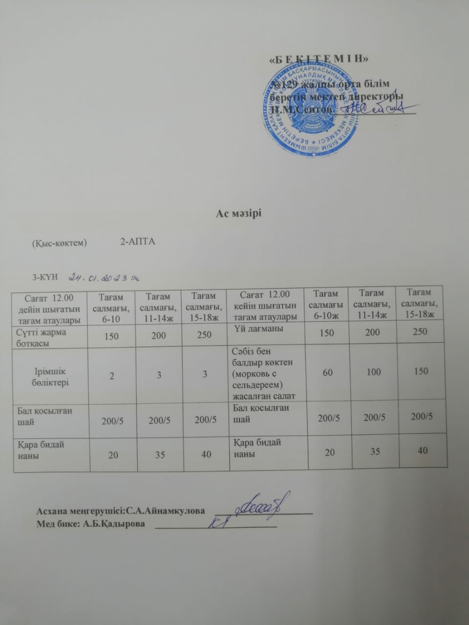 24.01.2024ж Бір күндік асхана мәзірі