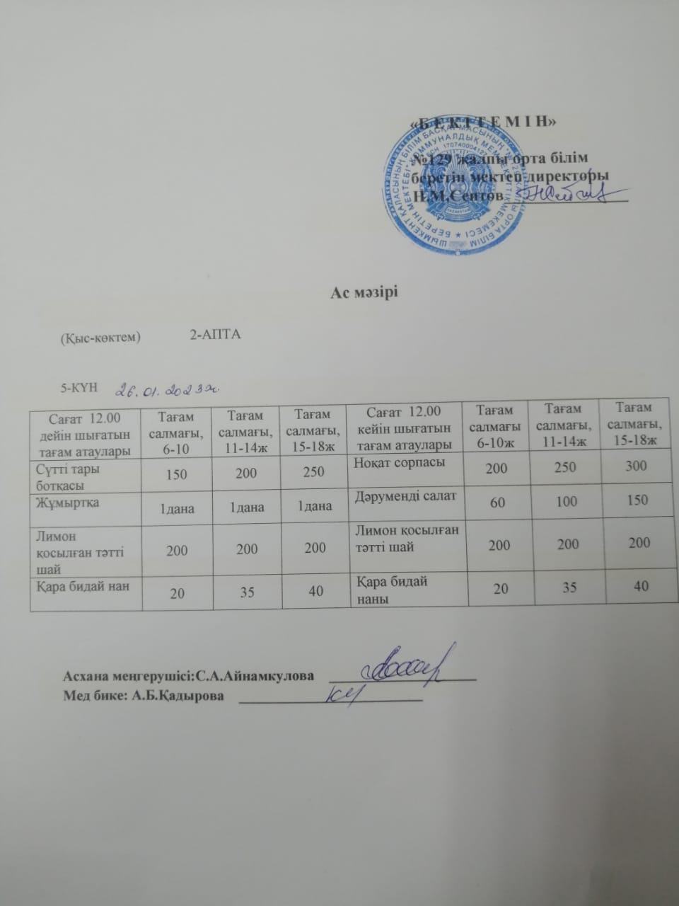 26.01.2024ж Бір күндік асхана мәзірі » №129 жалпы орта білім беретін мектеп