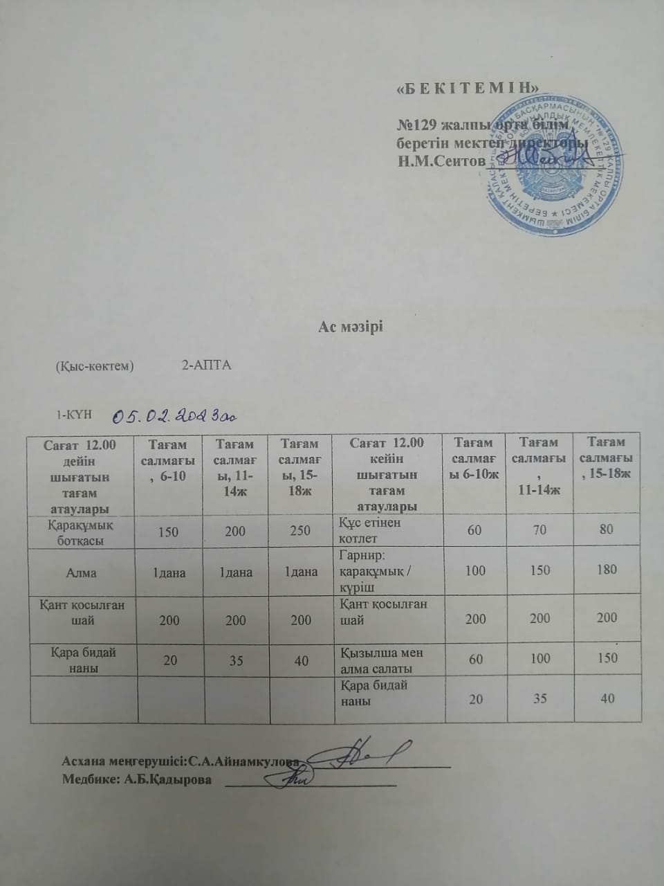 05.02.2024ж. Бір күндік асхана мәзірі » №129 жалпы орта білім беретін мектеп