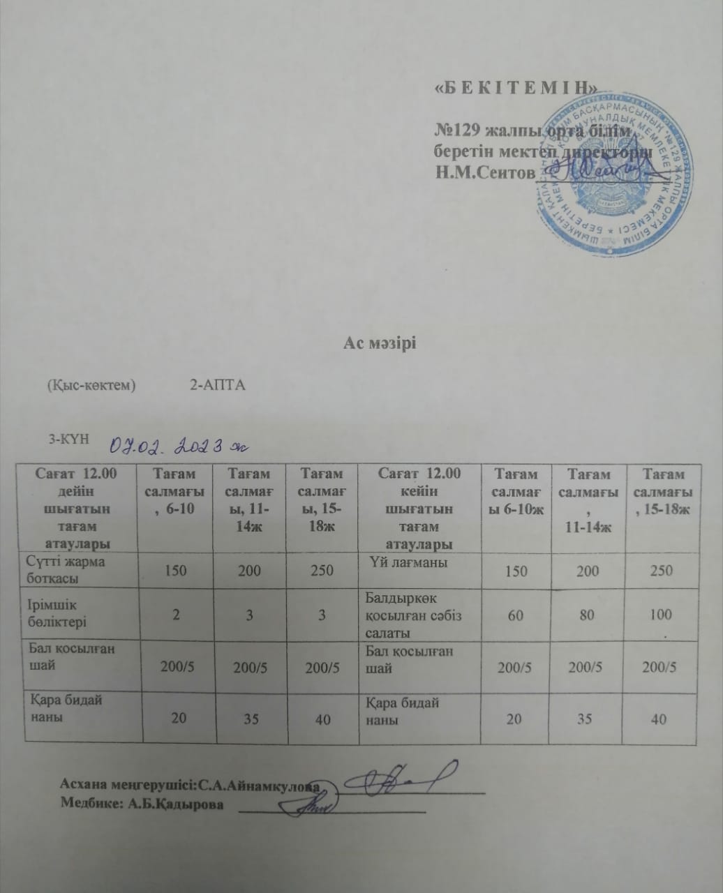 07.02.2024ж. Бір күндік асхана мәзірі » №129 жалпы орта білім беретін мектеп