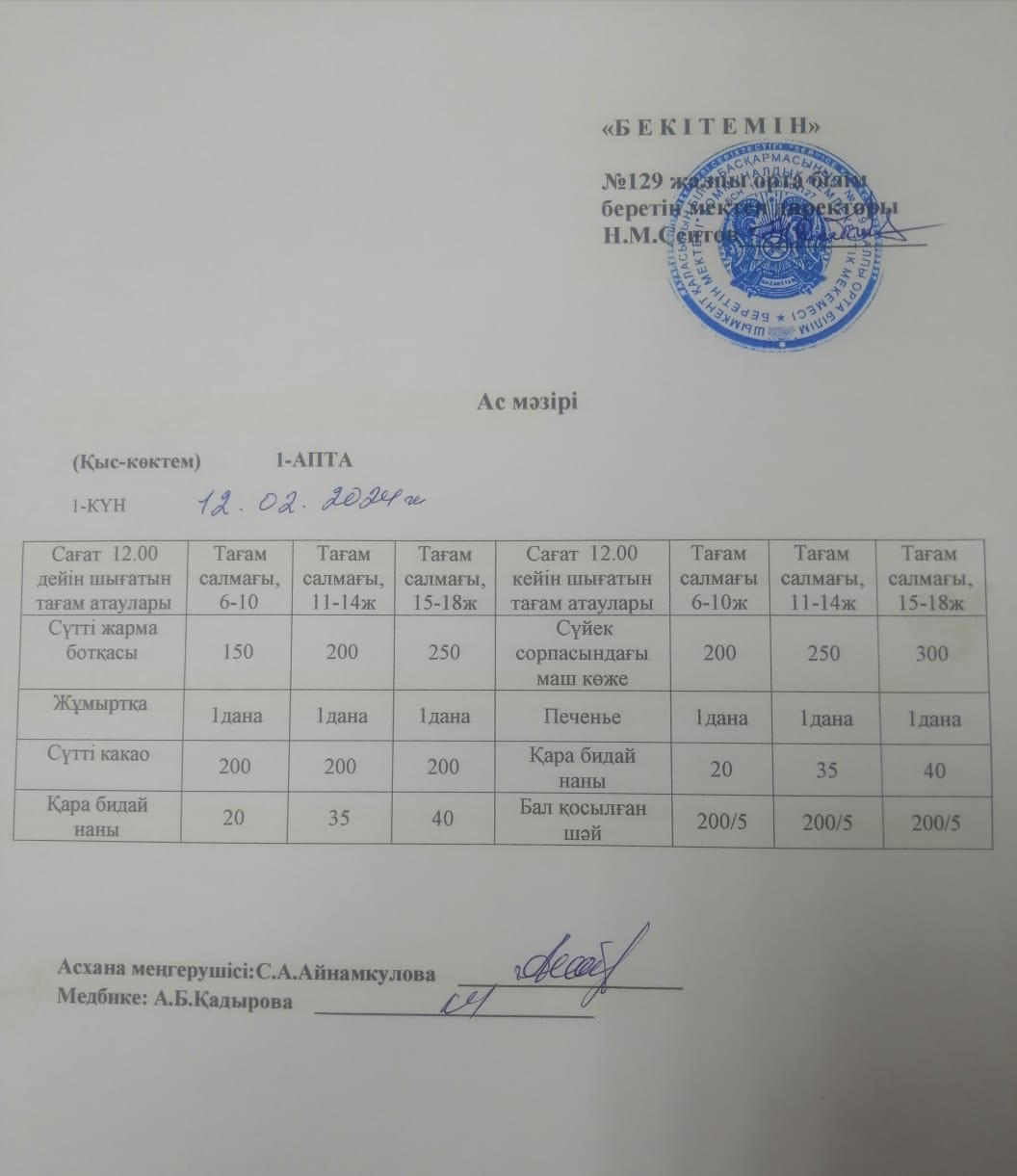 12.02.2024ж. Бір күндік асхана мәзірі » №129 жалпы орта білім беретін мектеп