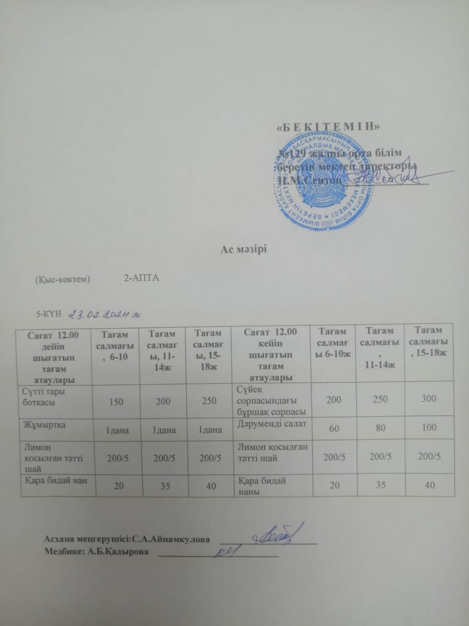 23.02.2024ж. Бір күндік асхана мәзірі » №129 жалпы орта білім беретін мектеп