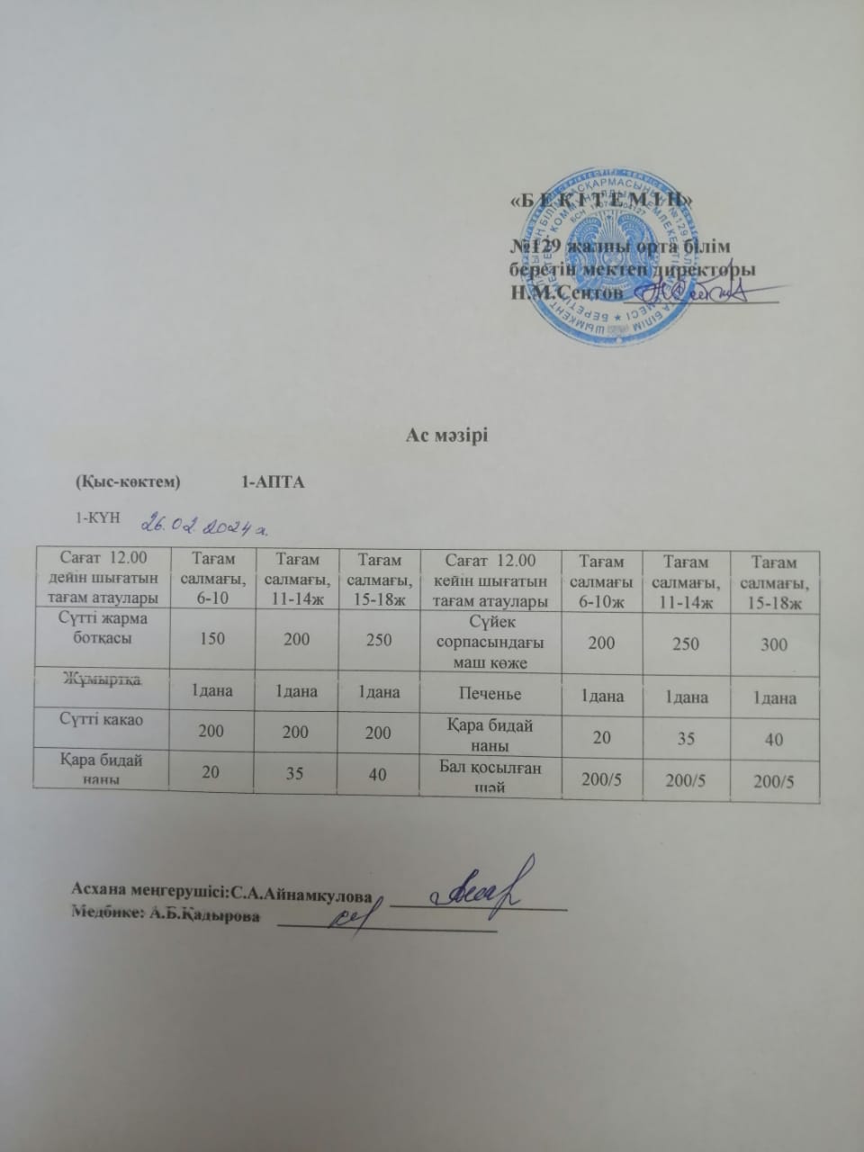 26.02.2024ж. Бір күндік асхана мәзірі » №129 жалпы орта білім беретін мектеп