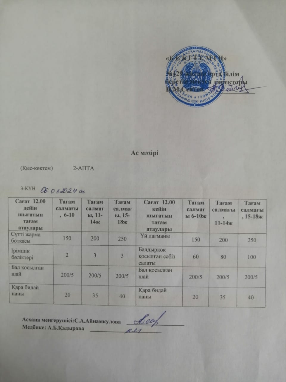 » » » 06.03.2024ж. Бір күндік асхана мәзірі