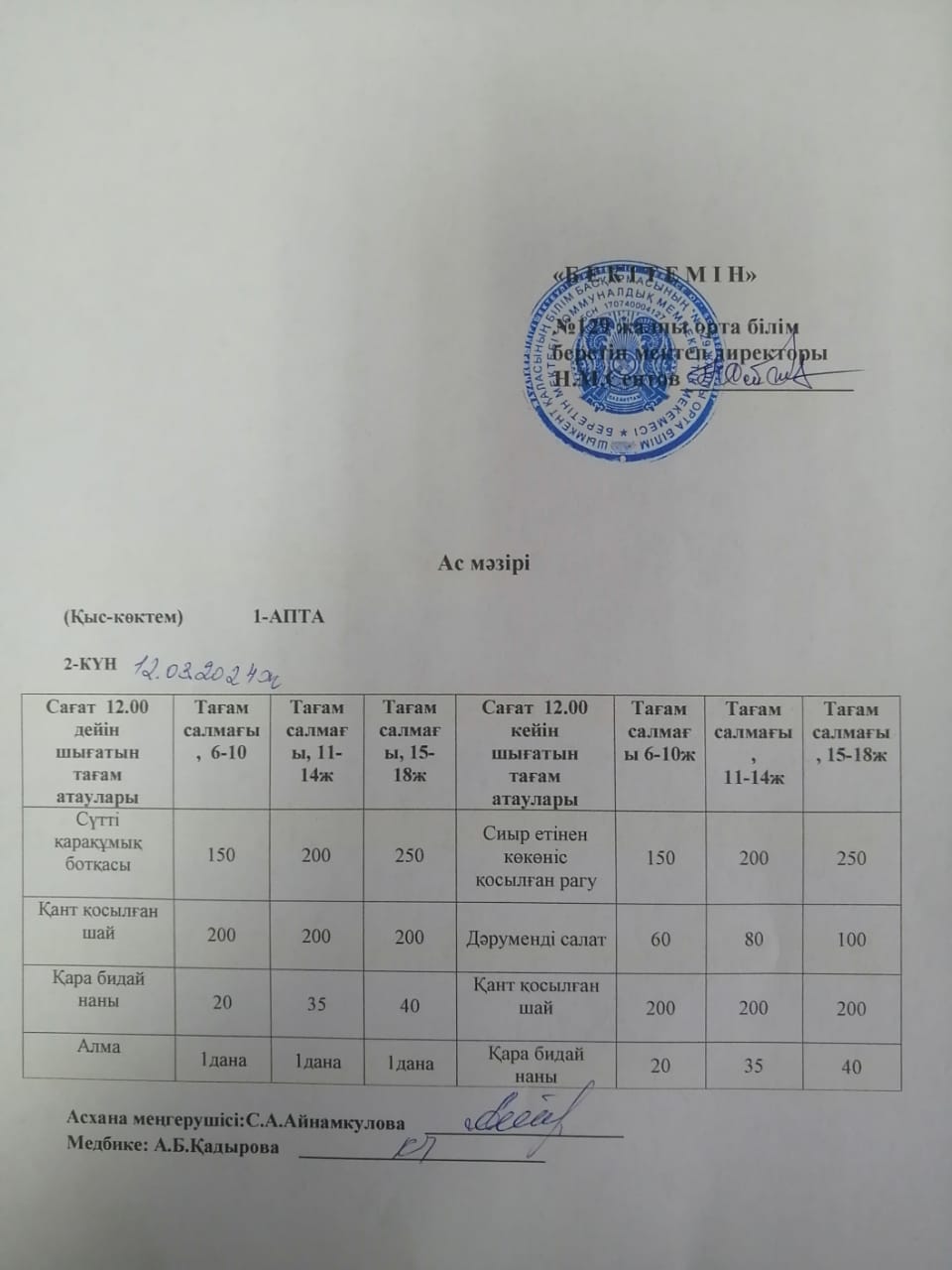 12.03.2024ж. Бір күндік асхана мәзірі » №129 жалпы орта білім беретін мектеп