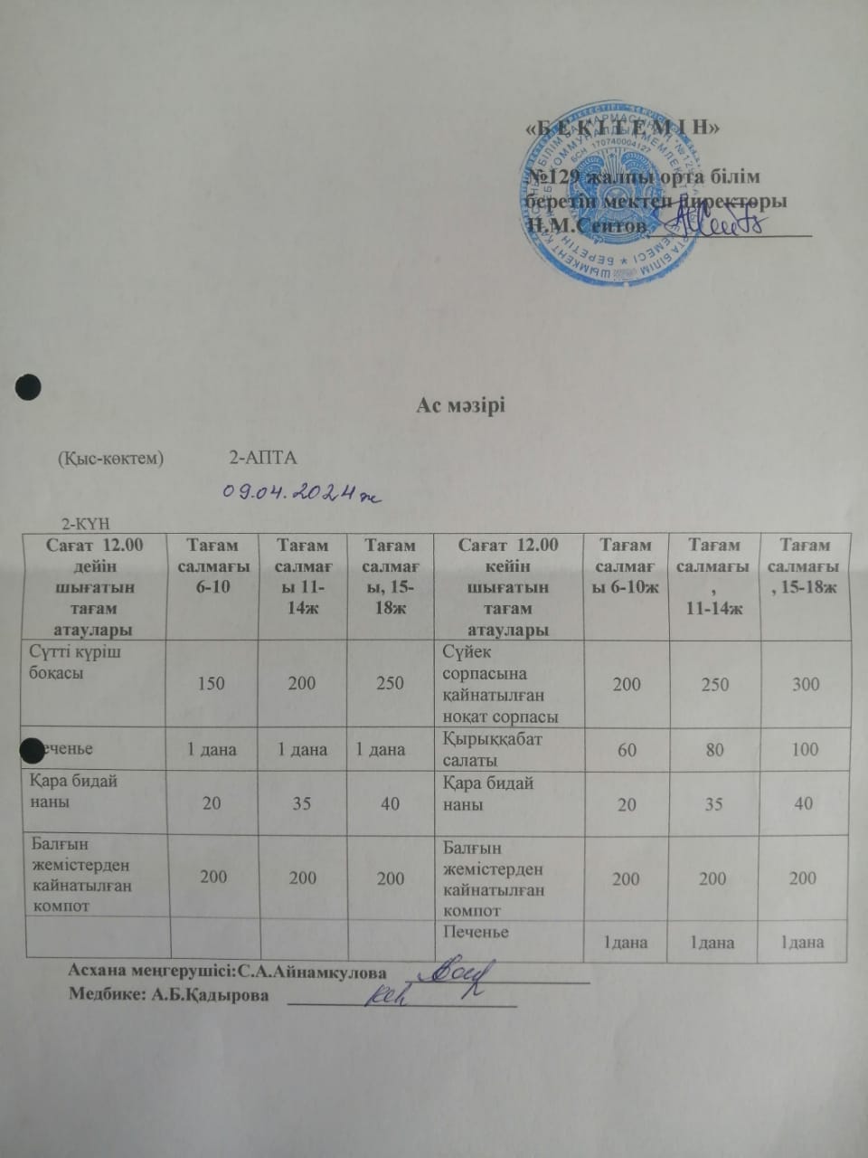 09.04.2024ж. Бір күндік асхана мәзірі » №129 жалпы орта білім беретін мектеп