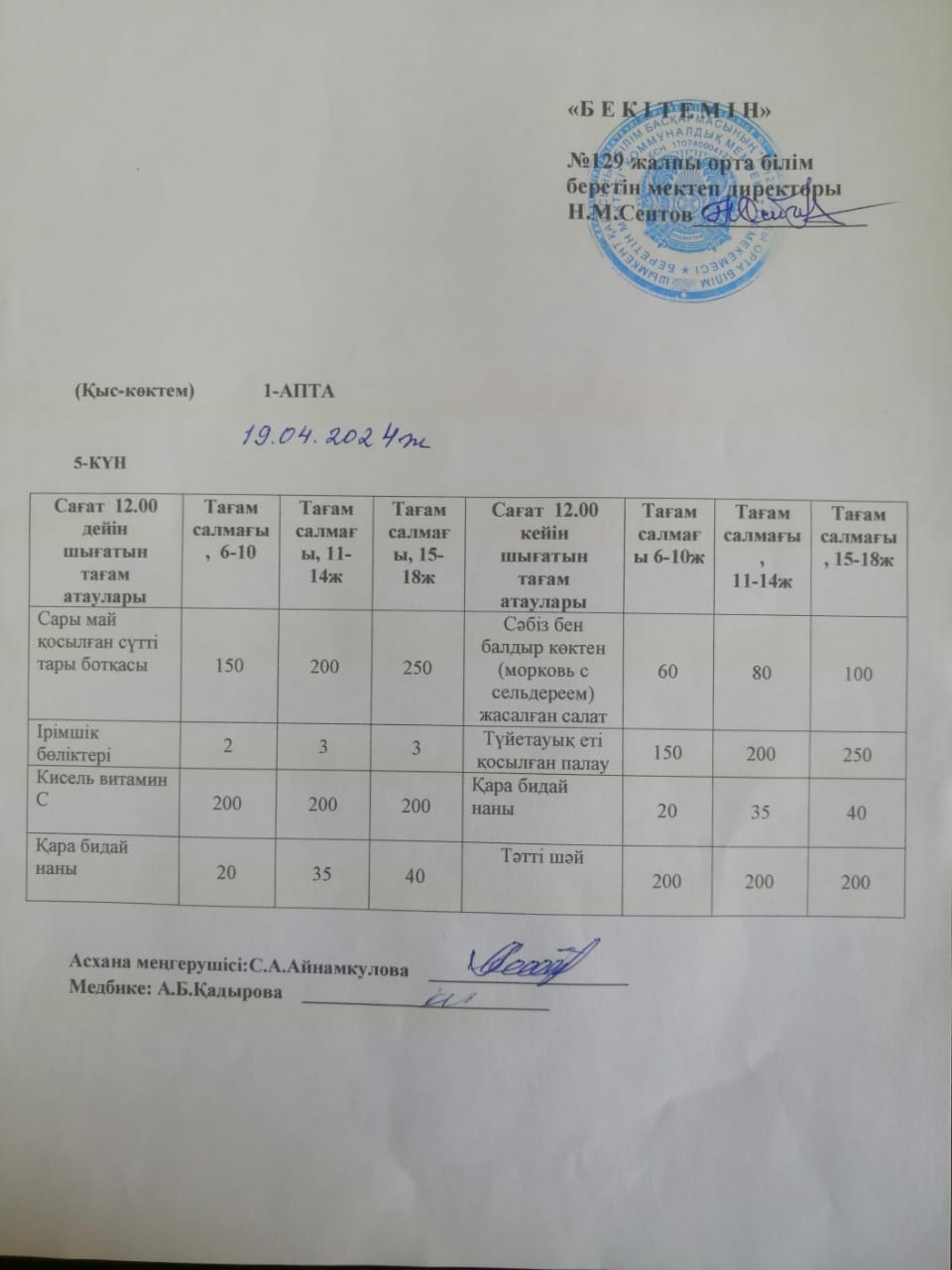 19.04.2024ж Бір күндік асхана мәзірі » №129 жалпы орта білім беретін мектеп