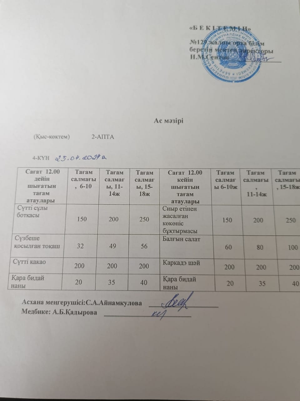 25.04.2024ж. Бір күндік асхана мәзірі » №129 жалпы орта білім беретін мектеп
